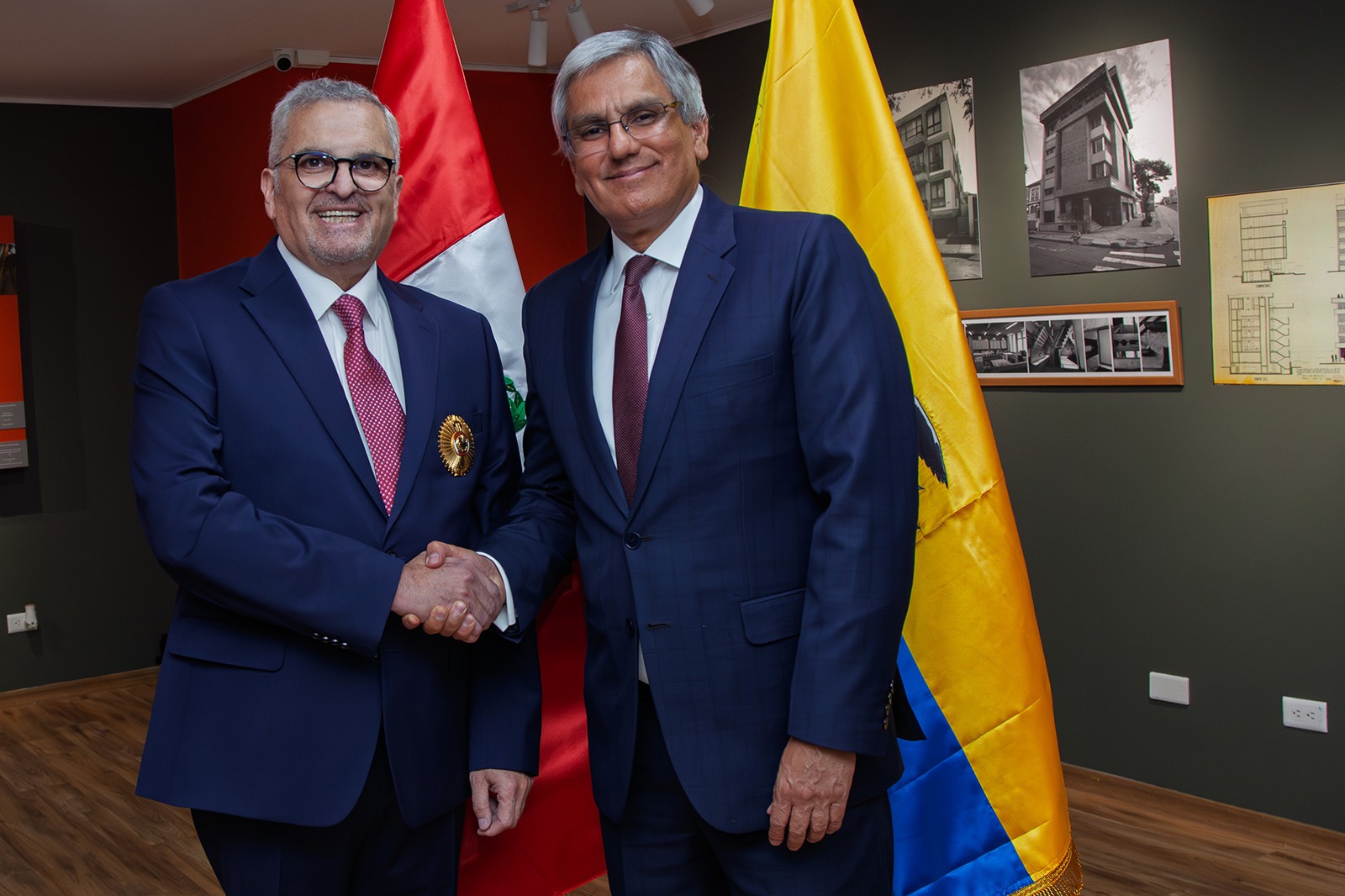 La distinción fue entregada por el Embajador del Perú en el Ecuador, José Zeballos Valle, quien destacó la trayectoria humana y profesional de Ricardo Hidalgo Ottolenghi y su sostenido aporte al fortalecimiento de los vínculos entre Ecuador y Perú.