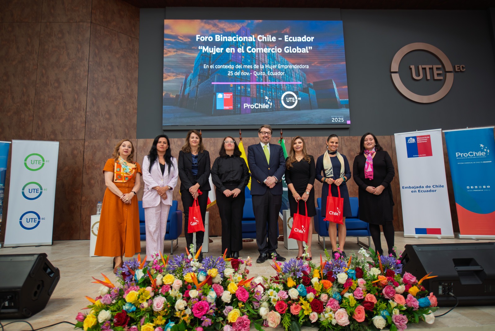 La Embajada de Chile en Ecuador, ProChile y la Universidad UTE realizaron el Foro Binacional Chile–Ecuador: Mujeres en el Comercio Global, un encuentro internacional que reunió a representantes del sector público, empresarial, académico y gremial de ambos países, así como a estudiantes. El evento se desarrolló el 25 de noviembre de 2025 en el Patio de la Cultura y la Paz de la UTE, en el marco del Mes y del Día Mundial de la Mujer Emprendedora.